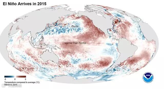 4月初时,美国国家海洋和大气管理局(NOOA)就在其官网称,预期已久的厄尔尼诺现象将最终在今年将到来。根据NOOA的解释,厄尔尼诺现象 (El Niño, 西语, 意为圣婴) ,主要指海洋与气候相互之间的强烈作用,导致太平洋东部和中部的热带海洋的海水温度异常地持续变暖。