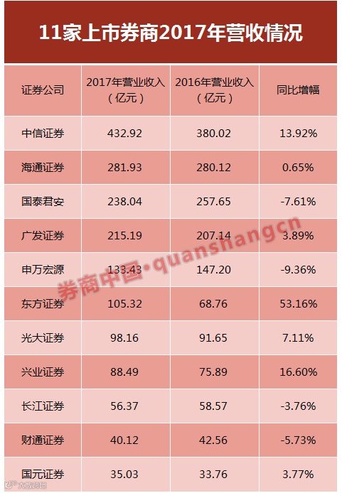 从11家已公布2017年度业绩快报的券商来看,中信证券在2017年营收及净利润都重新回归榜首。2016年营收和净利润均排名第二位。