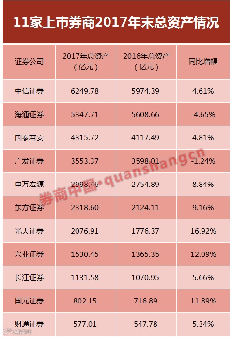 总资产增长较快的是光大、兴业和国元证券,分别较2016年增长16.92%、12.09%和11.89%。国元证券解释称,主要为公司提高财务杠杆率,债务筹资额有所增加,以及公司再融资成功实施,权益资产增加所致。