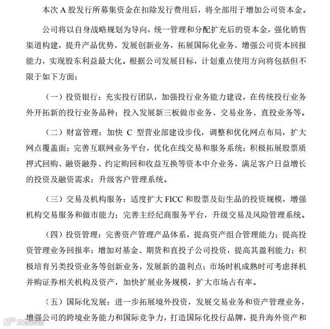 中信建投证券本次A股发行所募集资金在扣除发行费用后,将全部用于增加公司资本金。中信建投证券表示,将统一管理分配扩充后的资本金,计划重点使用方向将包括“投资银行、财富管理、交易及机构服务、投资管理、国际化方向、中后台建设”六大方面。具体如下: