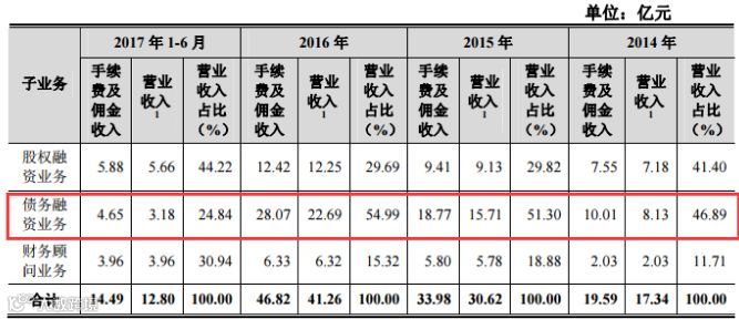 预先披露更新的IPO招股说明书显示,2014年、2015年、2016年和2017年1-6月,中信建投证券的投资银行业务手续费及佣金净收入分別为173520.25万元、306984.21万元、416282.61万元和130433.92万元,占营业收入的比重为20.21%、16.15%、31.40%和25.45%。