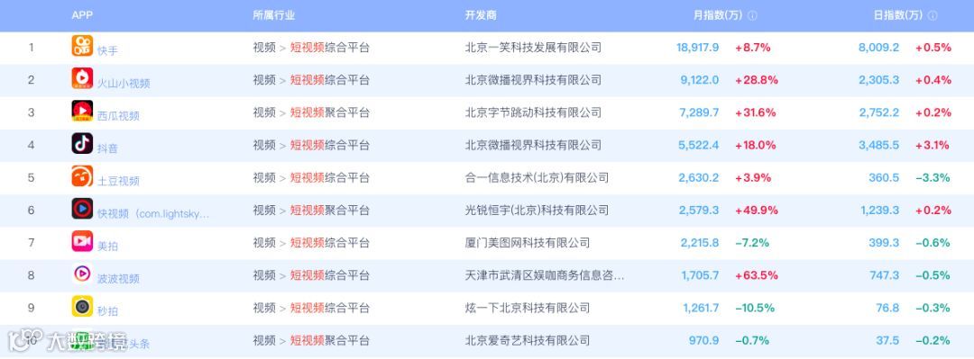 易观千帆指数排名前十的短视频APP: