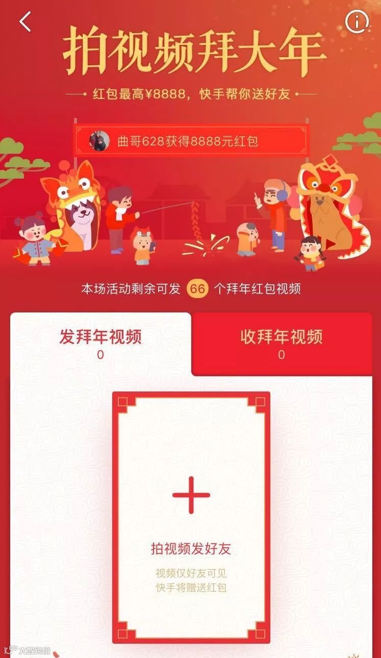 快手也在春节期间搞起了红包营销活动:6亿现金红包发送中。用户拍视频拜大年发给好友,快手将赠送红包,红包最高8888元。并滚动播报用户获得红包情况。