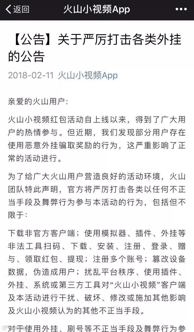 值得关注的是,火山小视频发布了《关于严厉打击各类外挂的公告》称,近期发现部分用户存在使用恶意外挂骗取奖励的行为……这份公告也从一个侧面反映了红包活动的关注度。