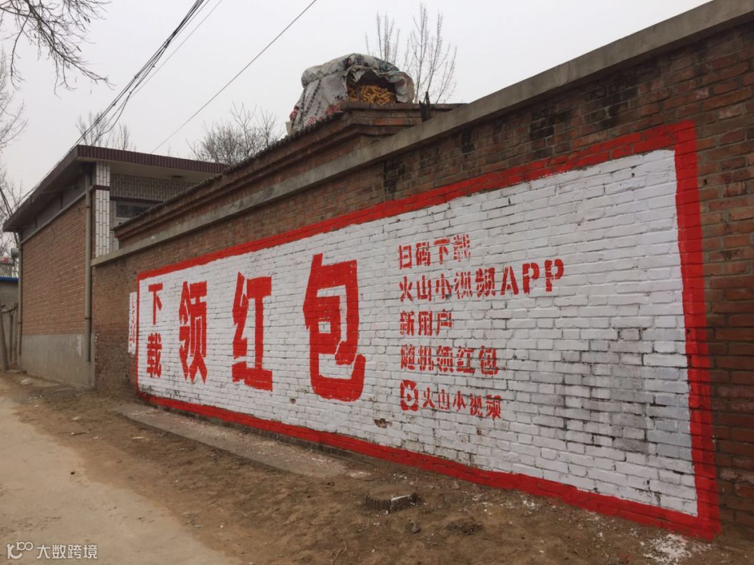 在记者的老家河北某乡镇,走几十米就先后在墙上看到了两处同样白底红字的大字宣传语。左侧竖着写“下载”,中间三个大字“领红包”,最右侧几行小字依次为“扫码下载(不过,没有二维码可扫)、火山小视频APP、新用户随机领红包”。最底下是火山小视频的logo和名称。