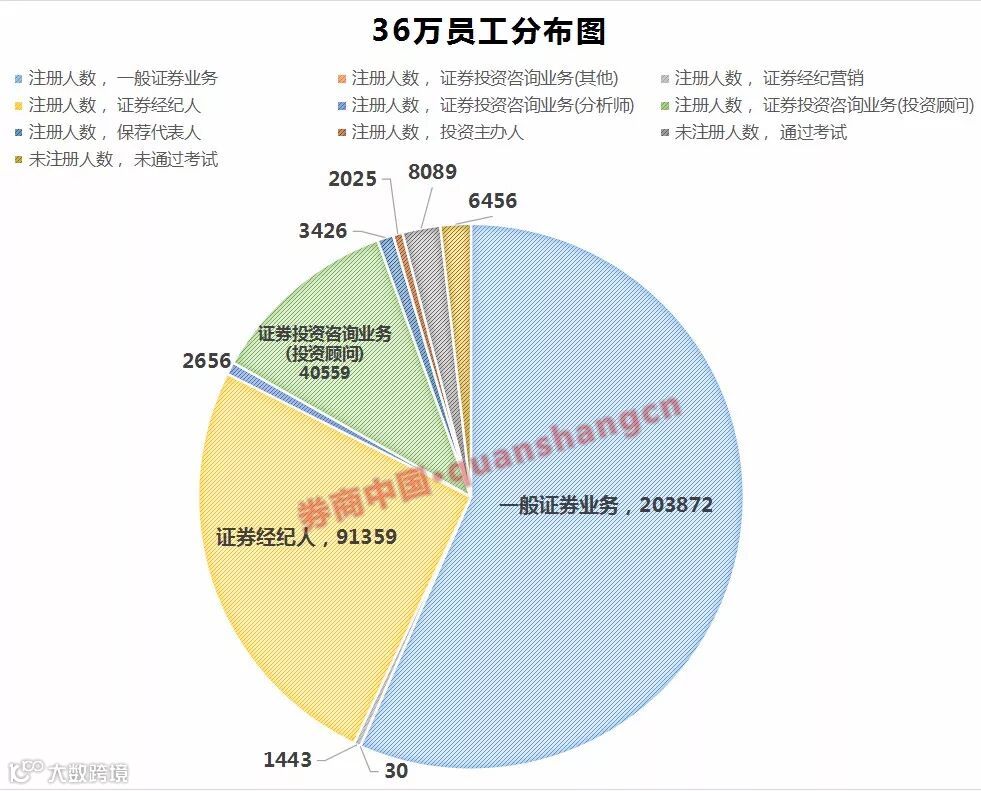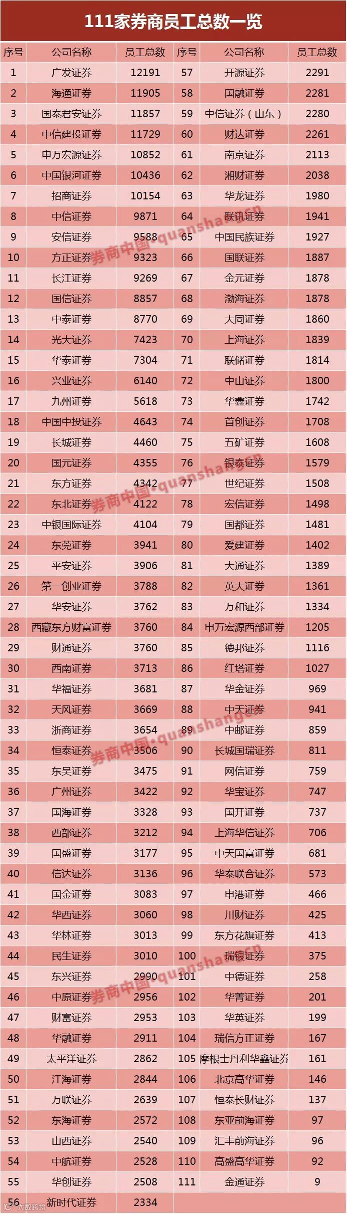 这是截至到2018年2月9日的券商最新员工数据,总人数为359913人。可以看出,广发证券、海通证券、国泰君安、中信建投、申万宏源、银河证券、招商证券7家券商员工数都超过了万名,排名前两位的广发证券、海通证券两家员工数相差不大。