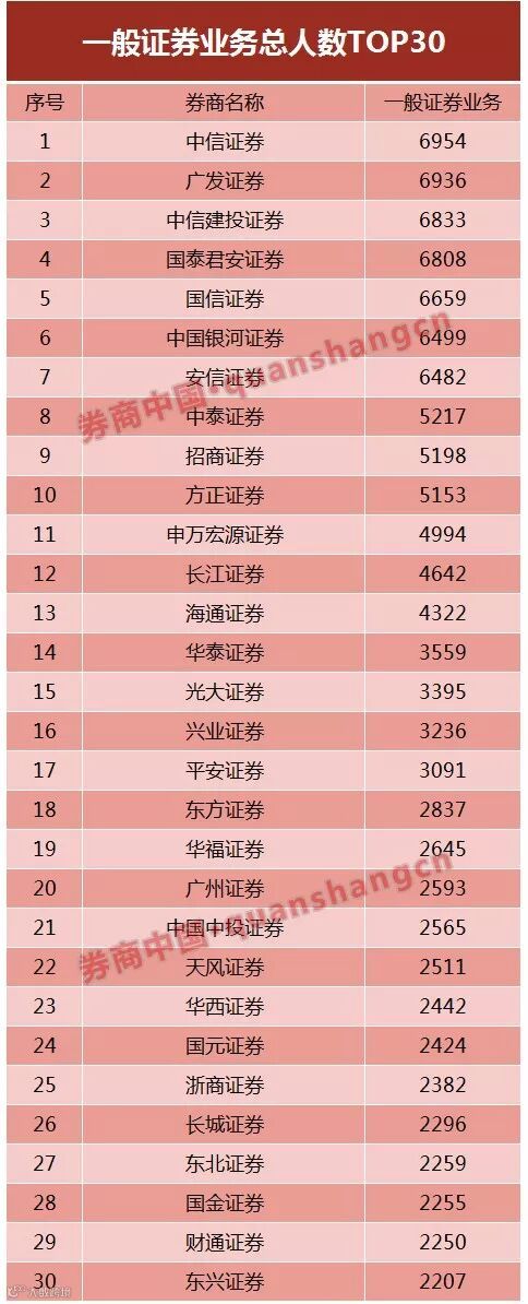 按中证协统计,一般证券业务总人数为203872人,中信证券、广发证券、中信建投人员配置靠前。