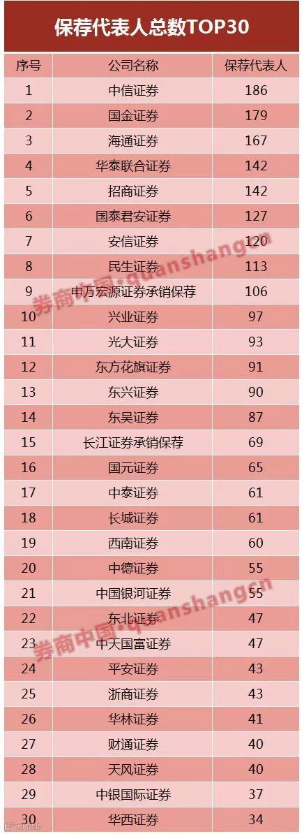 保荐代表人数量的多寡,代表着券商在首发、并购重组、再融资等重要业务方面的人员实力。可以看出,中信建投、广发证券、国信证券、国金证券在这方面的人员投入居前,IPO发审通过率较高的华泰联合,在这方面人员投入也较大。一些传统券商也在这方面追加人员设置,海通证券、安信证券、民生证券、申万宏源等券商保荐人数也不少。
