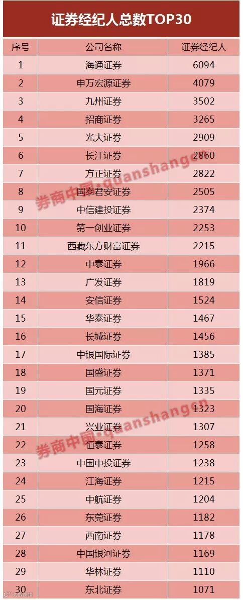 证券经纪人员总数为91359人,在配置上,海通证券、申万宏源、九州证券员工数较多,其中海通证券有二分之一的人员为证券经纪人员,九州证券经过一段时间的发力,证券经纪人数量已全行业排名第三。