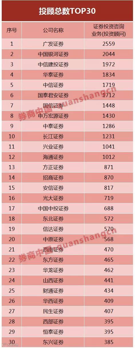 投资顾问总人数为40559人,占总人数比例为11.29%。各大券商都“舍得”投入人力,是仅次于经纪业务的人员配置,广发证券、银河证券、中信建投等券商人员投入居前,一些中小券商也将此块业务作为“必争之地”,东北证券、信达证券、中原证券等在这方面的人员占比较大。