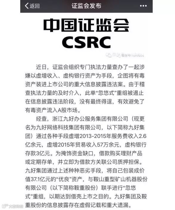 就在今天,证监会主席刘士余口中的“忽悠式”重组大案露出真容,与此前市场想象与猜测完全大不相同!首例“忽悠式”重组大案事关两方:重组方九好集团和上市公司鞍重股份。