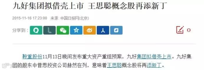 2015年11月13日晚间,鞍重股份发布重大资产重组预案,九好集团拟借壳上市。九好集团的股东中普思投资公司赫然在列,意味着王思聪概念股将再添新丁。彼时王思聪最喜欢的投资领域是游戏,他投资的5家已经上市公司里,有2家是游戏公司。那借壳上市的九好集团是做什么的,又是哪些方面打动了这位“国民老公”呢?我们今天就借这一机会,再来回顾九好借壳鞍重股份。