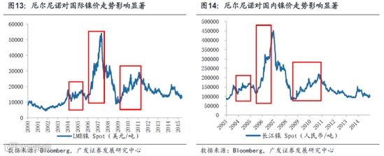 厄尔尼诺不仅会影响农产品的价格走势,对有色金属的价格波动也有显着影响。通常而言,金属开采过程中需要消耗大量水资源,而在厄尔尼诺影响下,有色金属资源国可能遭遇干旱或洪涝,因此金属开采会受到影响,继而对有色金属价格产生影响。我们结合厄尔尼诺影响的区域和有色金属分布区域,并参考历史上厄尔尼诺对有色金属价格的影响程度,认为此次厄尔尼诺将会对镍和铜的价格走势产生影响。