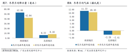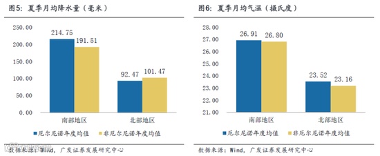 根据气象中心预测,此次厄尔尼诺强度不会高于1997-1998年那次。今年发生类似1998年大洪水的可能性小,但不排除是近年来降水明显偏多年份。具体到厄尔尼诺对降水和温度的影响上,可以通过对1997-1998年的厄尔尼诺进行分析以进行初步探索。1997-1998年的超强厄尔尼诺发生时,在降水量方面,南部地区:厄尔尼诺年度的降水量总是高于非厄尔尼诺年度的降水量(全年/夏季/冬季)。北部地区:厄尔尼诺年度的降水量总是低于非厄尔尼诺年度的降水量(全年/夏季/冬季)。在气温方面,厄尔尼诺年度的气温总是高于非厄尔尼诺年度的气温(南北部/全年/夏季/冬季)。其中,厄尔尼诺年度数据取1997年和1998年两年,非厄尔尼诺年度数据取90年代以来没有发生厄尔尼诺现象的年度。