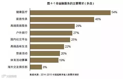 对于非金融服务而言,超高净值人群的需求集中于健康医疗和家族传承,其比例均在五成左右,其次为高端商旅服务、户外旅行和国内社交平台。
