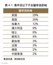 根据2014 年胡润百富发布的《海外教育特别报告》,亿万富豪平均送孩子出国的平均年龄为16岁,美国和英国是最主要的留学目的地,10 年前排名最前的加拿大和澳大利亚,已下降到第三和第四位。