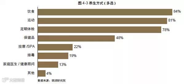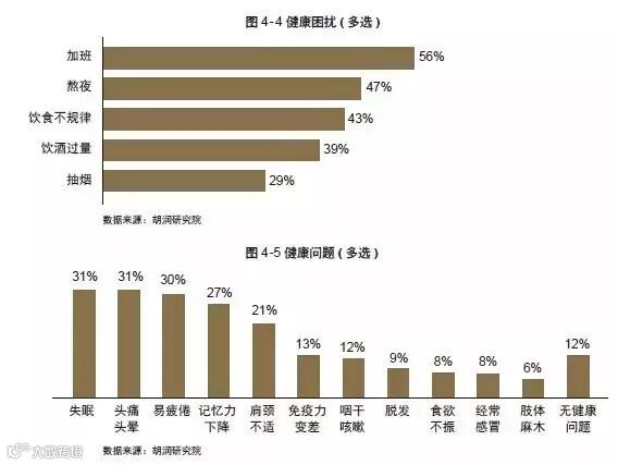 据2014 年胡润研究院研究结果显示,高净值人群对自身健康满意度不高,将近六成会加班,超过四成熬夜和饮食不规律,近四成饮酒过量,近三成抽烟,这些问题都造成了高净值人群很大的健康困扰,使他们对自身的健康状况缺乏信心。