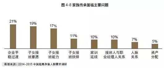 在中国,目前近七成超高净值人群面临家族传承的问题。在家族传承中,最关注的问题集中于价值观的传承,其比例将近占一半;其次是企业经营理念的传承。由此可见,在家族传承中,财富传承并不是最为重要的方面,只有价值观和企业经营理念得到传承,财富才能得以传承。