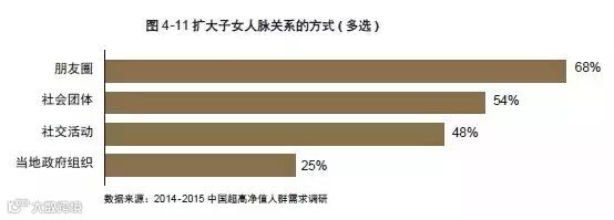 超高净值人群最希望通过朋友圈去扩大子女的人脉关系,其次是社会团体和社交活动。总体来说,对上述这些方式的认可度都较大。