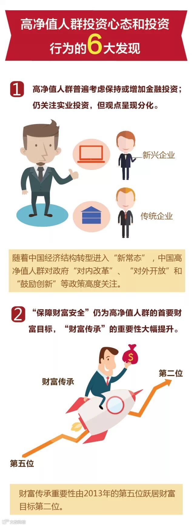 “财富传承”的重要性排序则从两年前的第五位跃居到了第二位,高净值人士希望精神财富伴随着物质财富的一并传承。