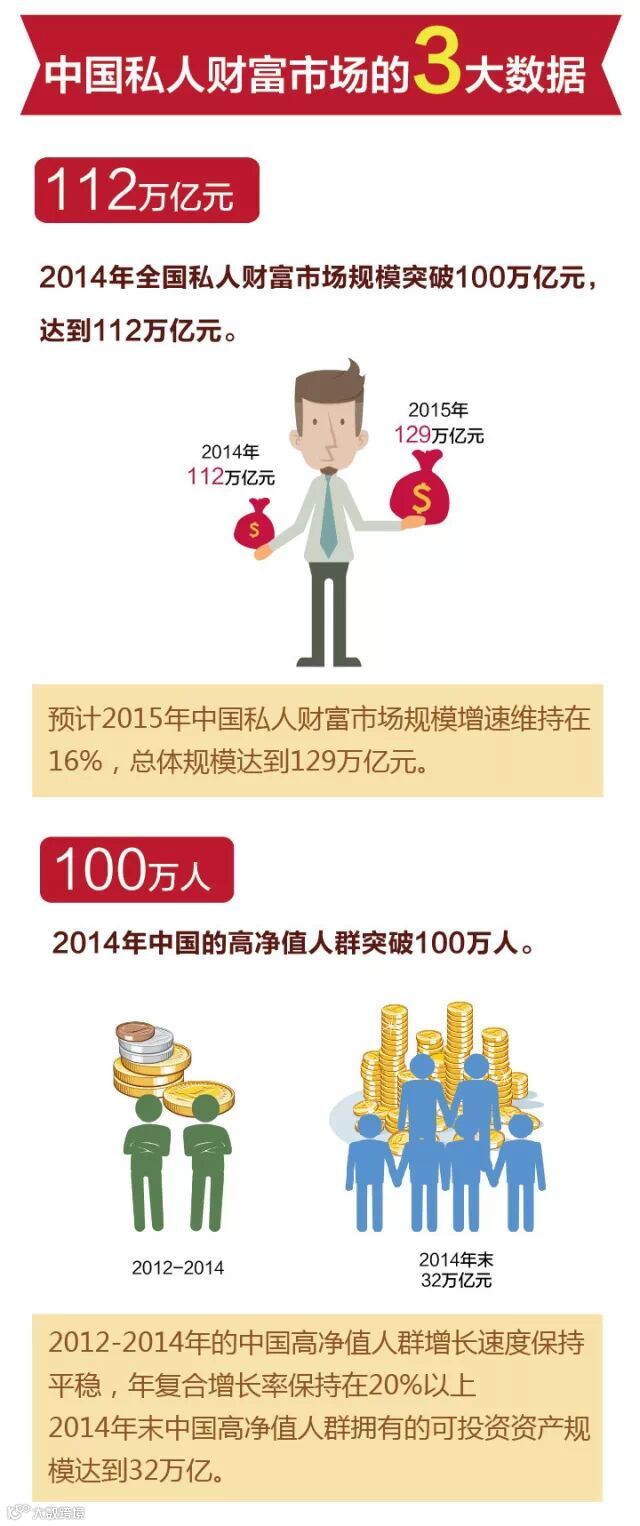 2014年末中国个人总体可投资资产达到112万亿人民币,相较2012年年均复合增长率达到16%。2014年末,中国高净值人群规模突破100万人,相较2012年增长了33万人,而相较2010年年底已经翻番。报告预计2015年中国私人财富市场仍将保持增长势头,全国个人总体可投资资产规模预计将达到129万亿元,同比增长16%;高净值人群规模将达到126万人,同比增长22%;高净值人群持有的个人可投资资产规模将达到37万亿元,同比增长17%。