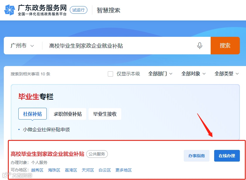 补贴办理方式(除求职创业补贴外):登录广东政务服务网→搜索相应补贴,点击【在线办理】即可申请。目前补贴都是直接拨付到个人所填写的账户哦!