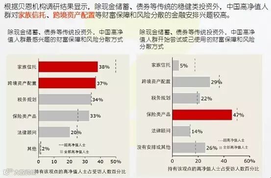 调研结果显示,除现金储蓄、债券等传统的稳健类投资外,中国高净值人群对家族信托、跨境资产配置等财富保障和风险分散的金融安排兴趣较高。但在目前实际安排中,现有的财富保障和风险分散手段主要依赖保险和跨境资产配置。