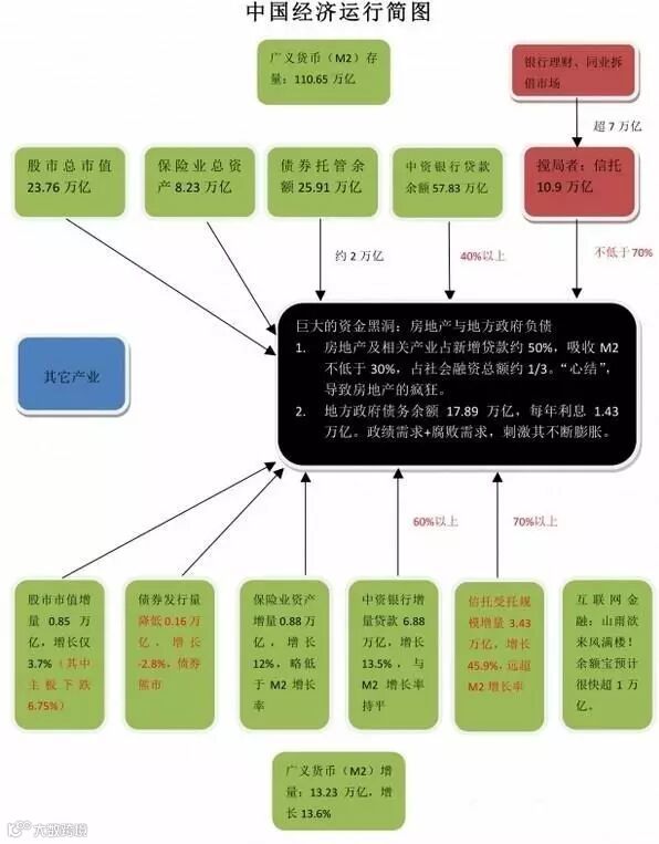 从投向来说,以我的经验,说这10万亿中有70%以上投向了房地产和政府都算是保守的,很多项目在表面上看起来是投向了所谓“工商企业”,或者是所谓“股权投资”,或者更高级的所谓“财产权信托”,实际钱都流到了房地产和政府手中。就这样,通过非标的撮合,两个本来应该降速的超级引擎又转起来了,银行也能赚钱了,GDP又能保持平稳增长了!