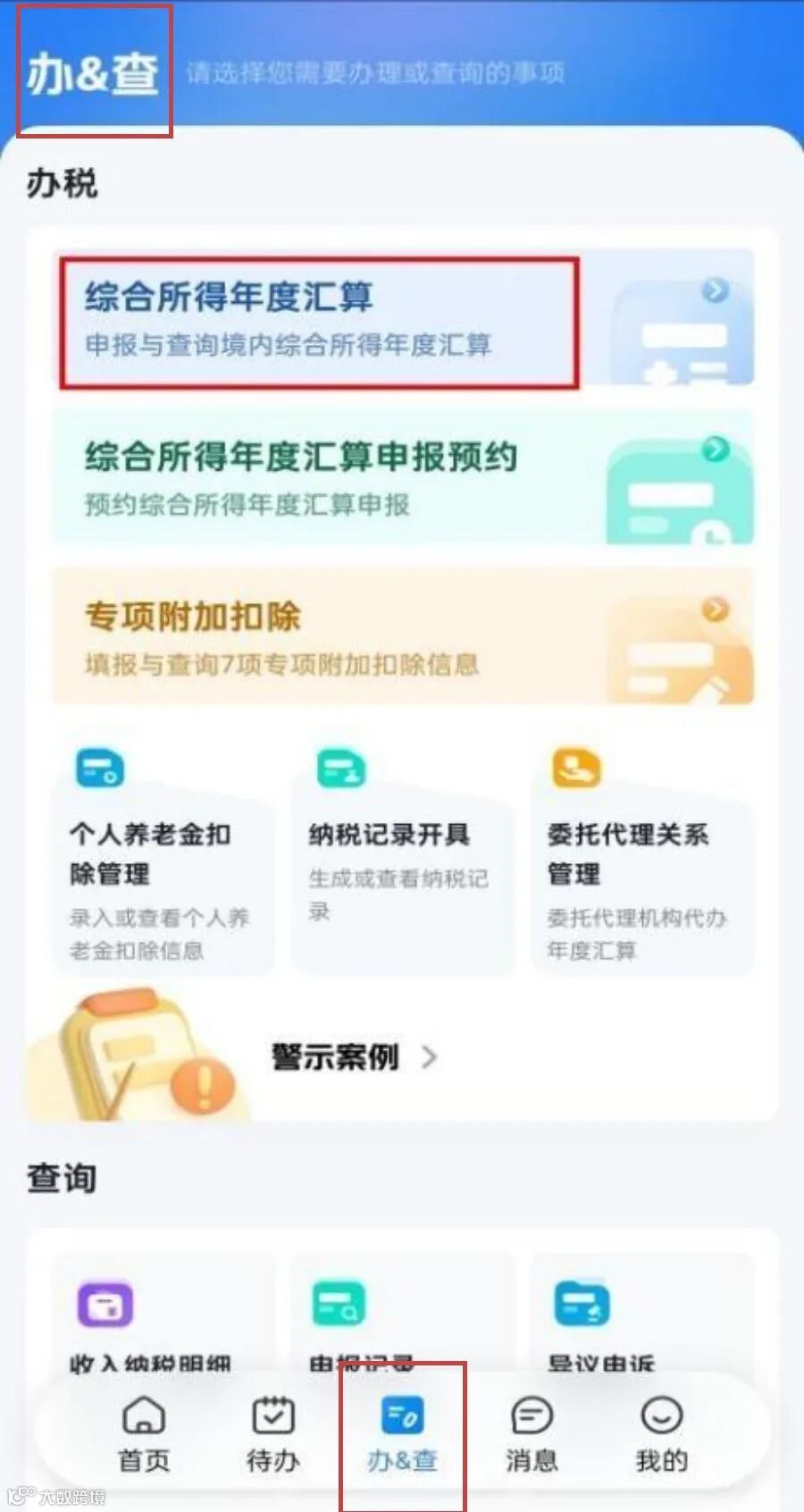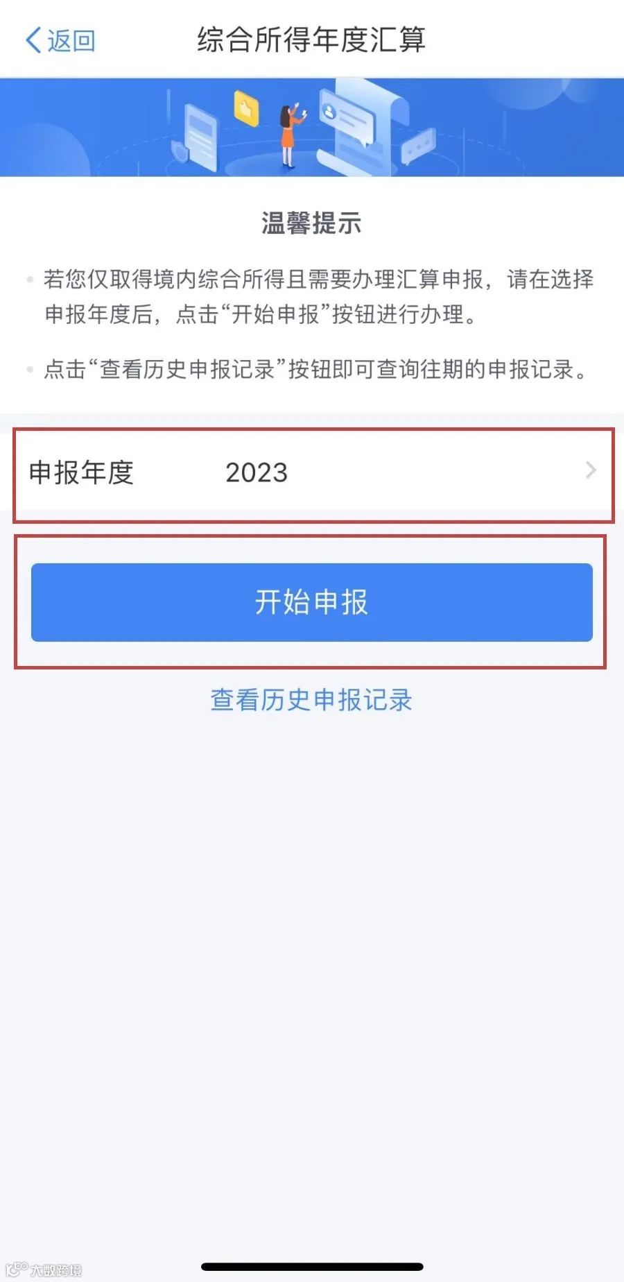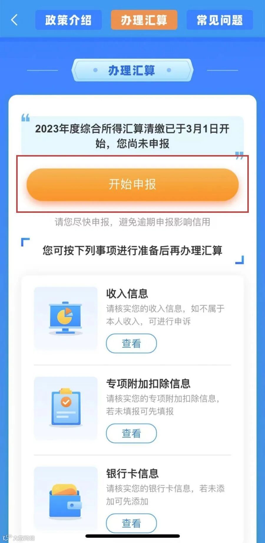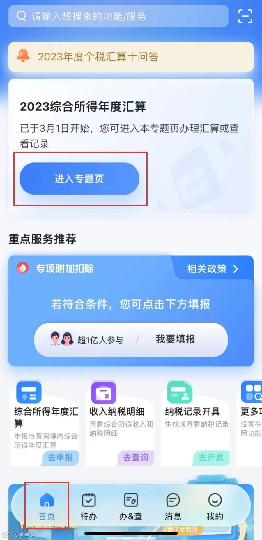 登录个税APP,在【首页】2023综合所得年度汇算专题,点击【进入专题页】—【开始申报】。或者在【办&查】模块点击【综合所得年度汇算】,选择申报年度【2023】—【开始申报】。