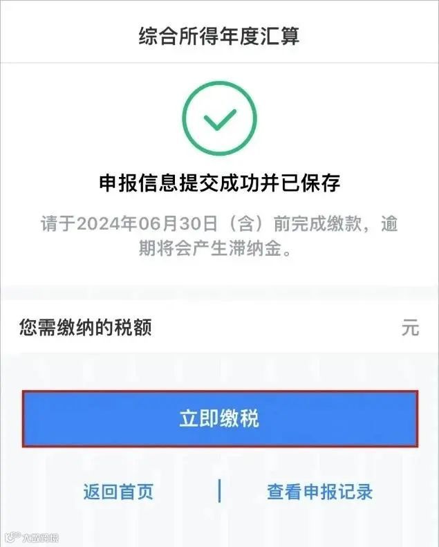 若您不满足免予申报条件需要补税,请点击【提交申报】,点击【立即缴税】,确认支付金额后选择缴税方式,完成税款缴纳。