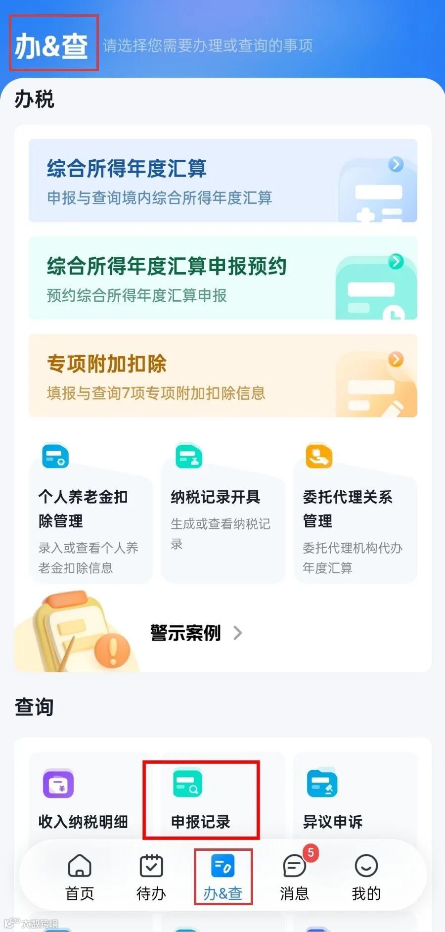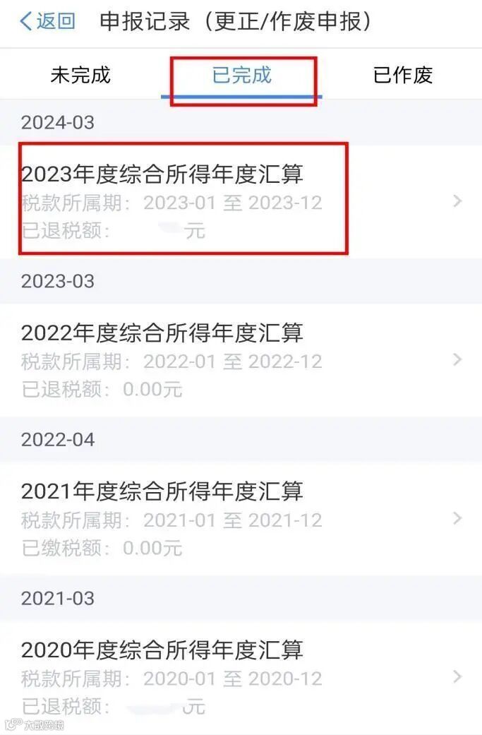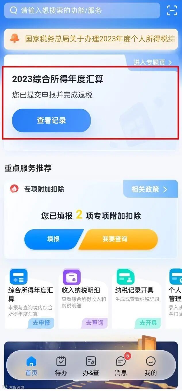 或点击【办&查】—【申报记录】—【已完成】—【2023年度综合所得年度汇算】,即可看到详细的申报、缴税和退税记录。
