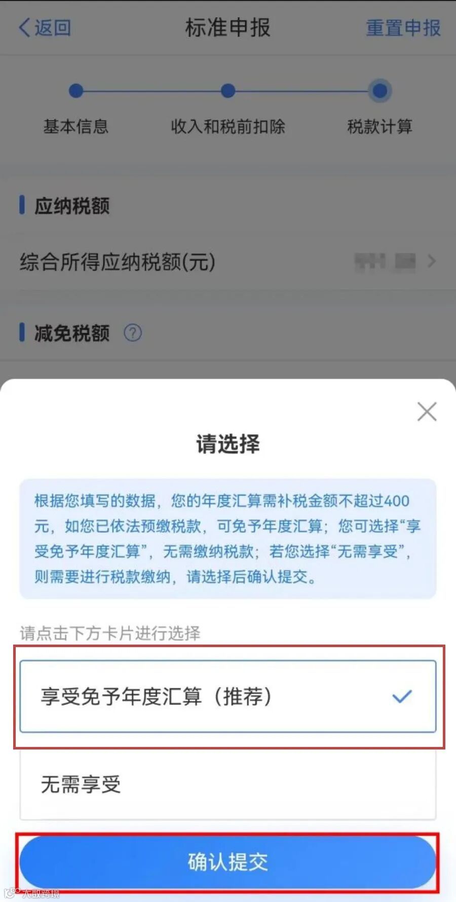 若您全年收入不足12万元且有应补税额,或者全年收入超过12万元但应补税额≤400元,如已依法预缴税款,按照规定可以免予汇算申报。您可直接点击【享受免予年度汇算(推荐)】。