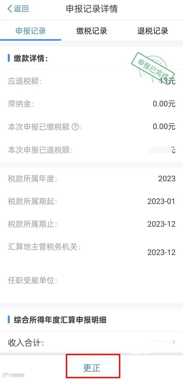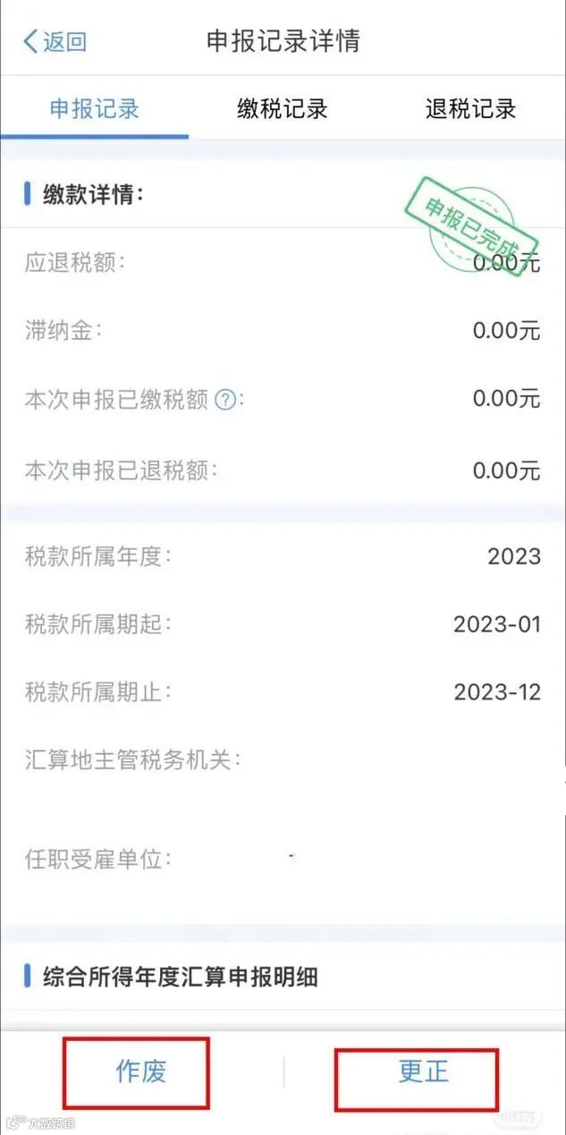 可登录【办&查】—【申报记录】—【已完成】—【2023年度综合所得年度汇算】更正或作废申报。选择需要更正或作废的申报记录,如果“申报记录详情”页面下方显示【作废】或【更正】,表示您既可以选择办理更正申报,也可以选择办理作废申报。如果只显示【更正】那表示您只能办理更正申报。