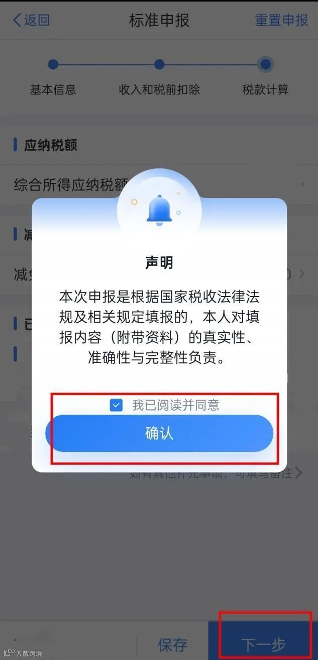 系统会自动计算出您的【应补税额】或【应退税额】,并在左下方显示,请确认申报真实性、准确性和完整性。