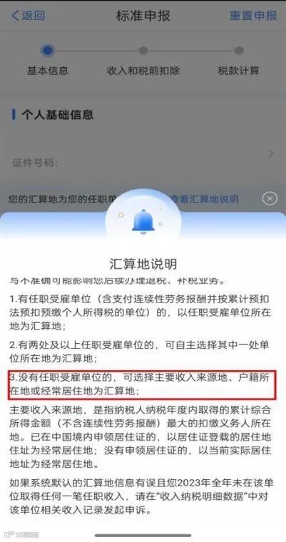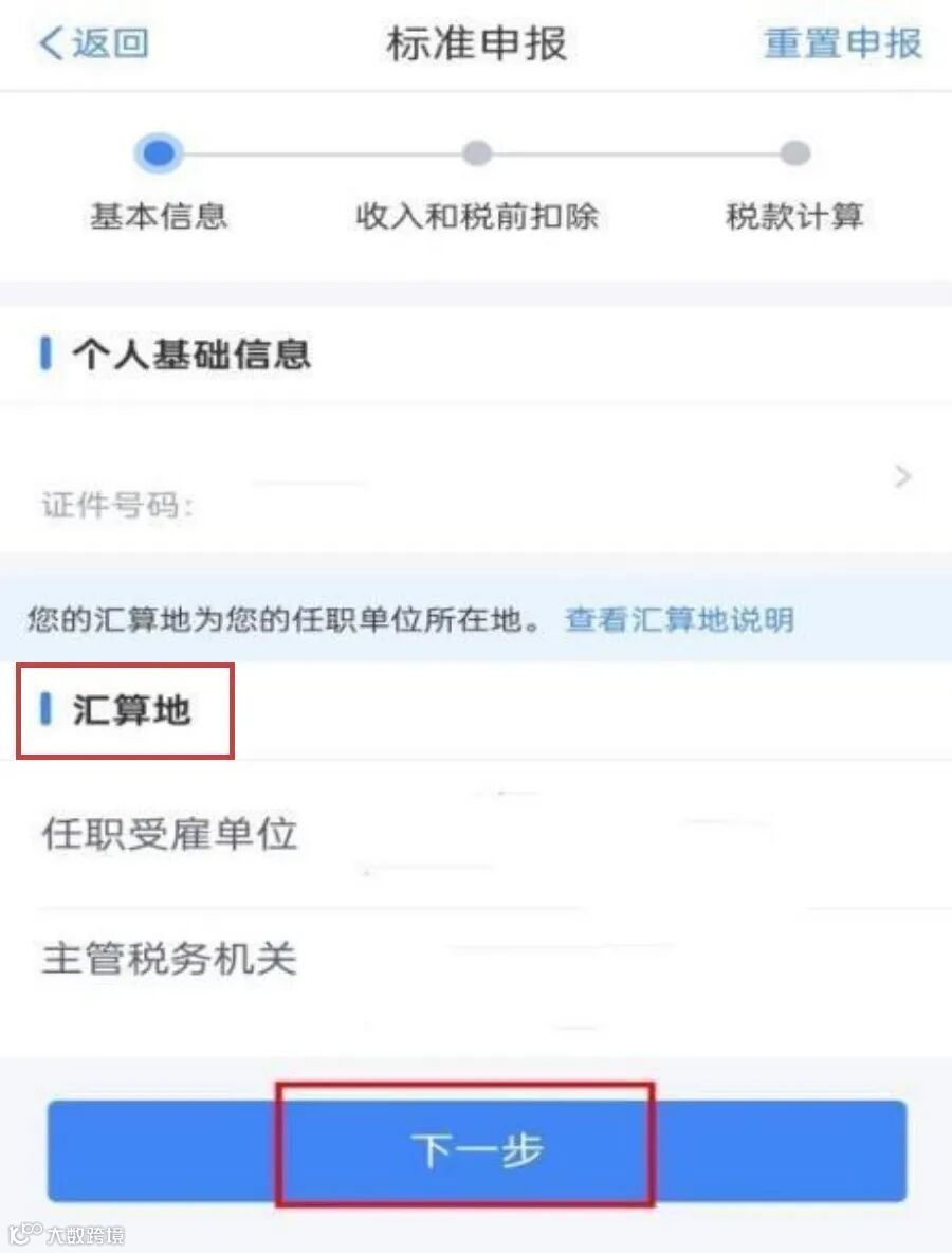 核对个人基础信息,选择或确认【汇算地】,点击【下一步】。若有多处任职受雇单位,请选择其中一处;若无任职受雇单位,可在主要收入来源地、户籍所在地或经常居住地中选择一处。