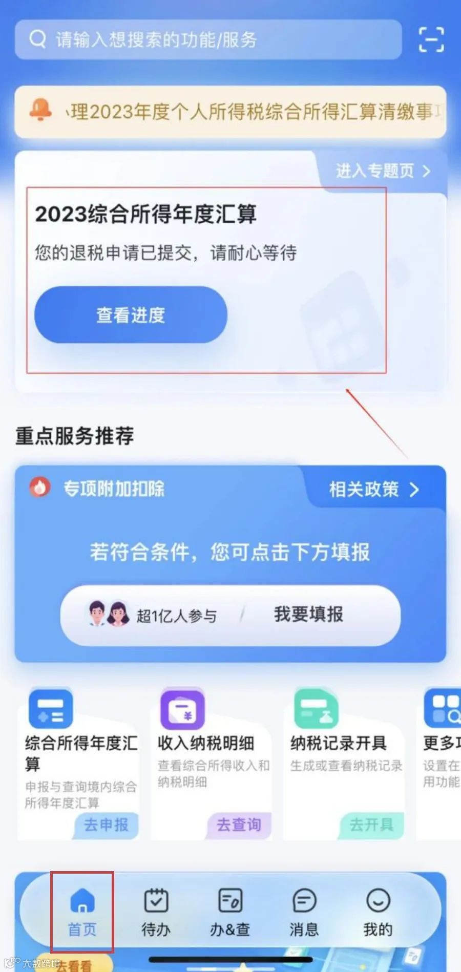 申报完成后,如您需要查看办理进度,可点击个税APP首页上方【2023综合所得年度汇算】随时查看办理进度。