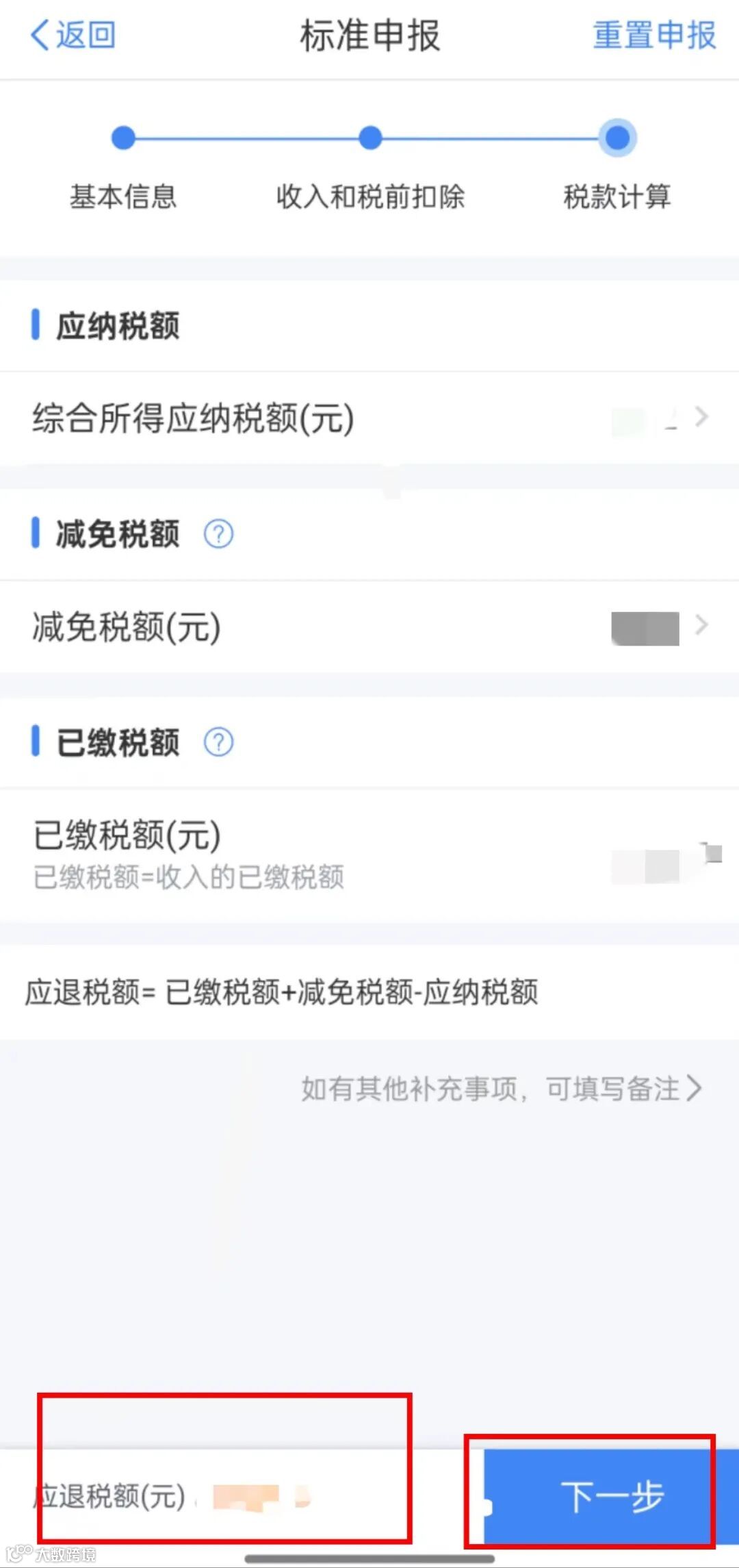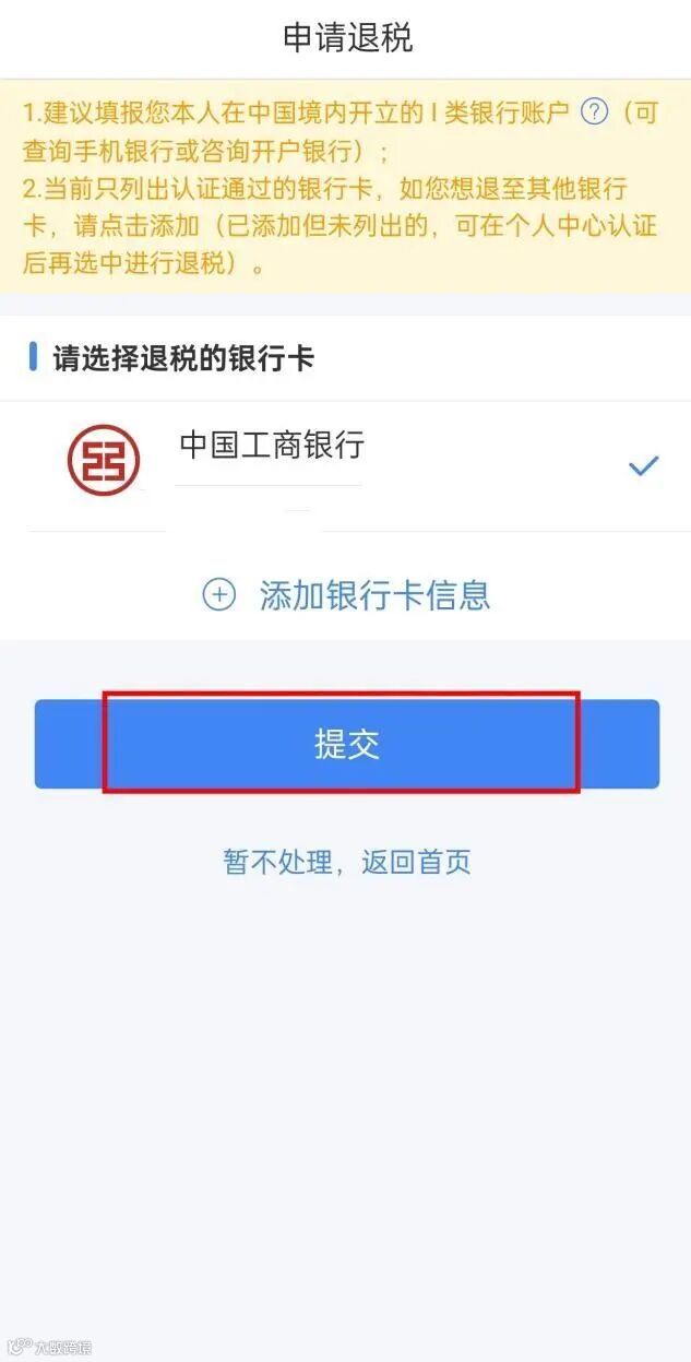 若您存在应退税额,请点击【下一步】,如选择【申请退税】,选择或添加银行卡,点击【提交】。