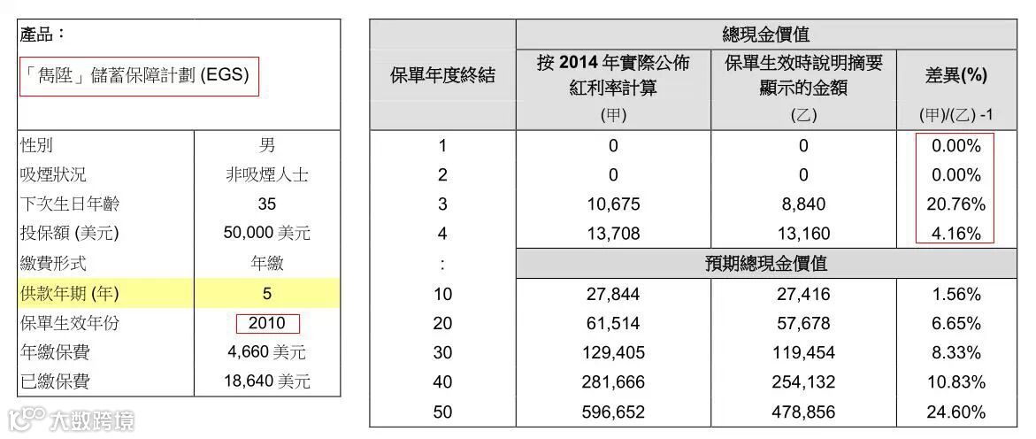 2010年签署的保单合约中约定2014年保单现金价值应为7,140美元,而2013年该保单实际现金价值为7,632美元,分红超过预期6.89%。