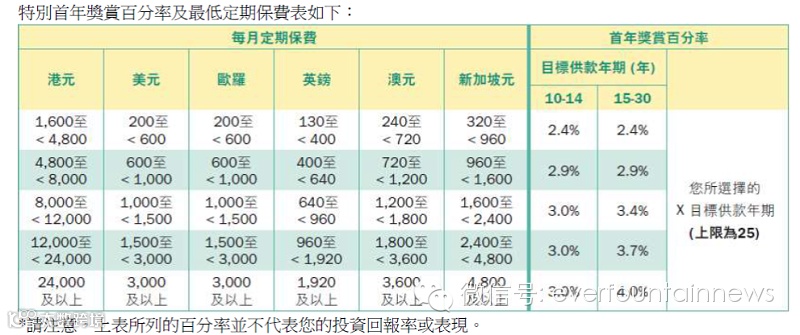 特別首年獎賞:凡於推廣期內成功申請並獲繕發雋宇保單(目標供款年期為10年或以上)之客戶,可獲派發最高達已繳首年定期保費100%的特別首年獎賞.特別首年獎賞百分率及最低定期保費表如下: