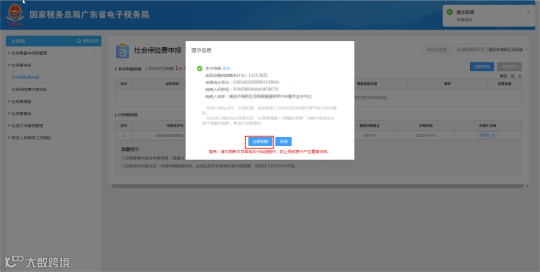 适用于用人单位进行社会保险费申报操作,申报成功后产生应缴纳的社会保险费数据。