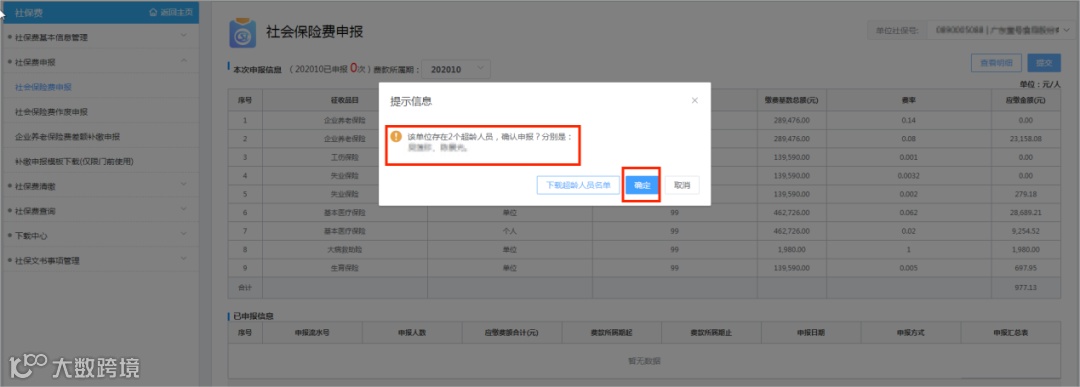 ★注:如果本次申报不包含有超龄人员,则不会弹出超龄人员的提示窗口;
