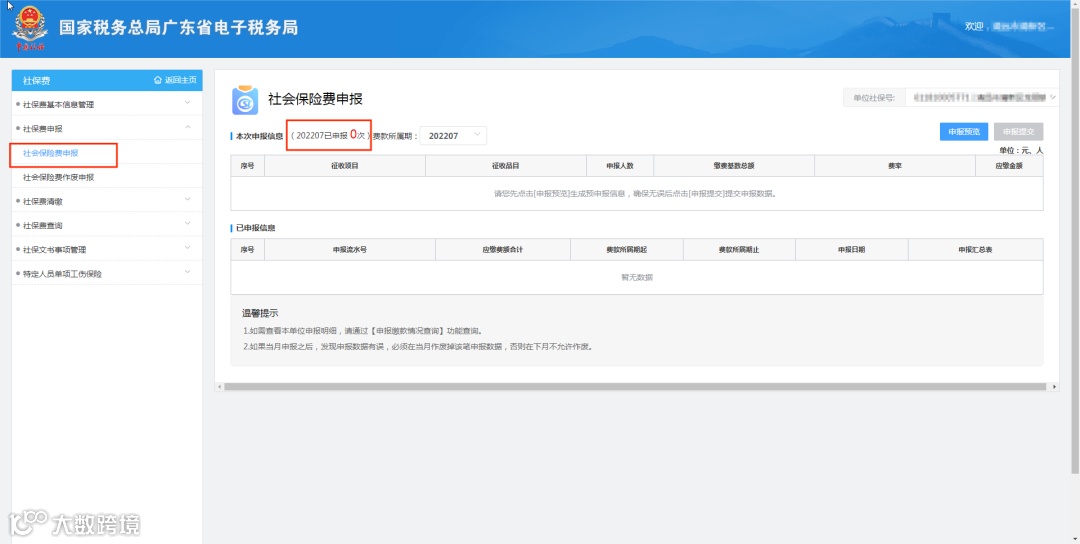 a.点击菜单【社会保险费申报】,进入社会保险费申报界面;如果本月未进行申报,申报次数显示为0;