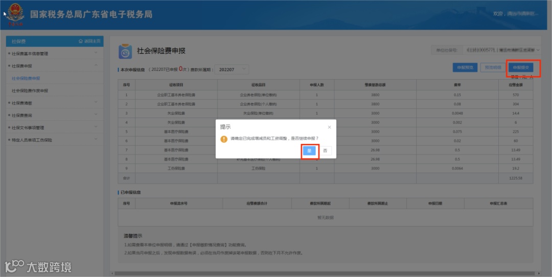 d.确认本次申报信息无误后,点击【申报提交】弹出“提交确认”对话窗口,点击【是】,系统校验【本次申报信息】的待申报人员信息;