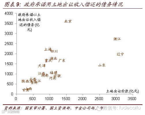 地方政府土地出让收入主要受房地产市场影响。国有建设用地按照土地用途主要分为住宅用地、商业服务用地、工矿仓储用地、基础设施用地。土地收入主要来自住宅用地和商业服务用地,也就是房地产市场。基础设施用地主要采用划拨而非出让的方式,不会创造大量收入。工业用地价格远低于住宅和商业服务用地的价格,但征地成本都一样,因此地方政府从工业用地出让中获得的收入很少。2013 年主要城市工业用地平均地价为每平米 700 元,而商业服务用地和住宅用地分别为 6306 和 5033 元,是工业地价的 9 倍和 7 倍(图表 4)。
