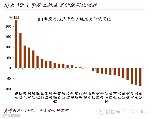 部分地区债务风险上升。根据 2013 年底国家审计署发布的《全国政府性债务审计结果》,2012 年底 11 个省级、316 个市级、1396 个县级政府承诺以土地出让收入偿还的债务余额 3.5 万亿元。部分地方审计部门公布了当地情况。以土地出让价款衡量当年土地出让收入,债务/收入比例(政府承诺以土地出让收入偿还的债务/土地出让价款)较高的地区包括上海、北京、陕西、四川、天津、重庆、湖北、广西等地区(图表 9)。而 1 季度房地产开发企业购臵费降幅较大的有陕西、山西、天津、云南、江西、广西、贵州等地区(图表 10)。以此来看,未来地方政府债务风险容易爆发的重点地区可能是陕西、天津和广西等地。