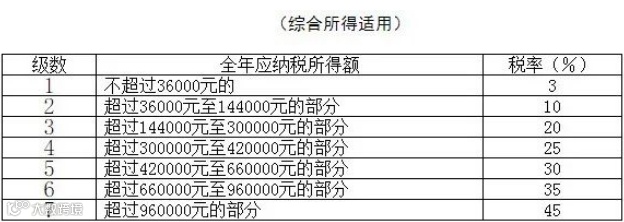 综合所得是指居民个人取得的工资、薪金所得;劳务报酬所得;稿酬所得和特许权使用费所得,适用百分之三至百分之四十五的超额累进税率(预扣率表见前述一、二)。