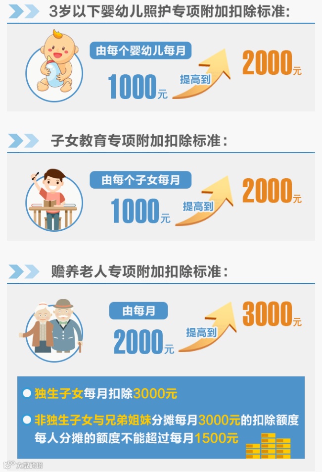 为进一步减轻家庭生育养育和赡养老人的支出负担,根据国务院《关于提高个人所得税有关专项附加扣除标准的通知》,自2023年1月1日起提高3岁以下婴幼儿照护、子女教育、赡养老人三项个人所得税专项附加扣除标准。