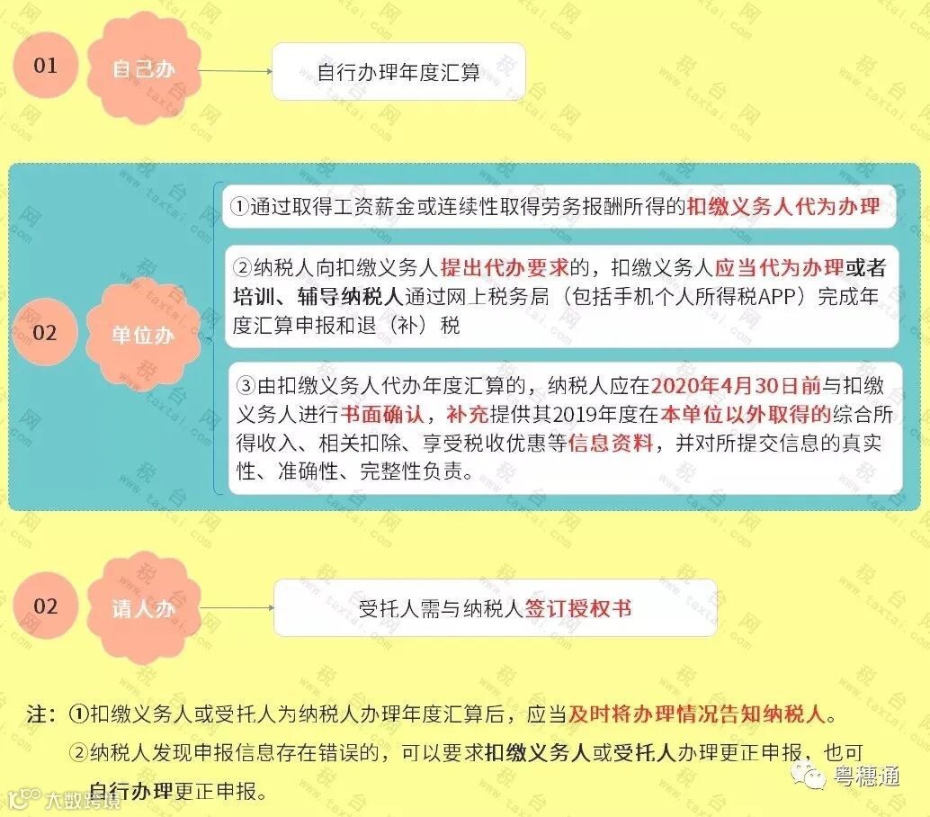1.若纳税人需要所在单位代办2019年度的综合所得年度汇算,需在2020年4月30日前与单位进行书面确认;逾期未确认的,则需在2020年6月30日前自行办理年度汇算。