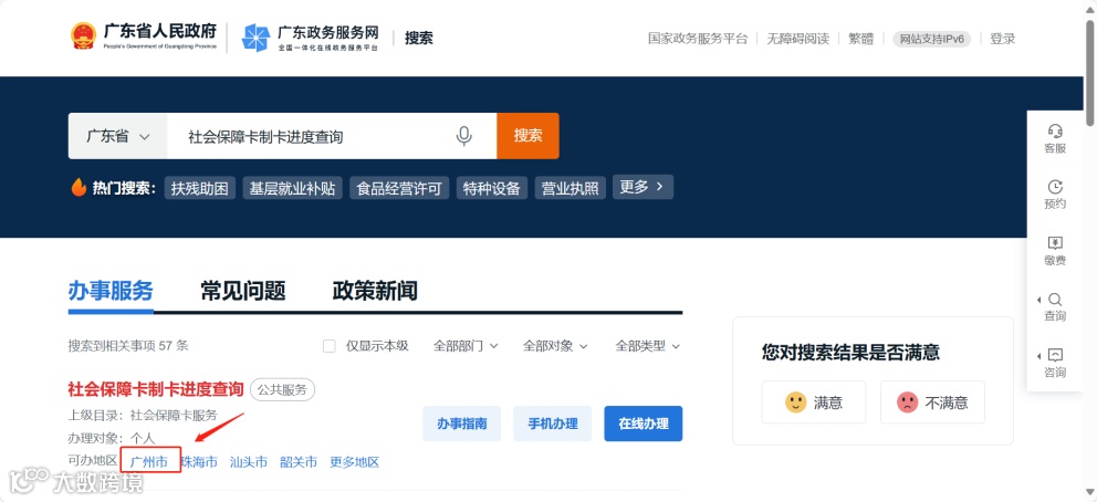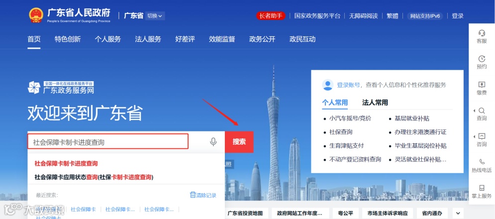 登录“广东政务服务网”官网,在首页搜索栏搜索“社会保障卡制卡进度查询”后选择“广州市”自助查询。