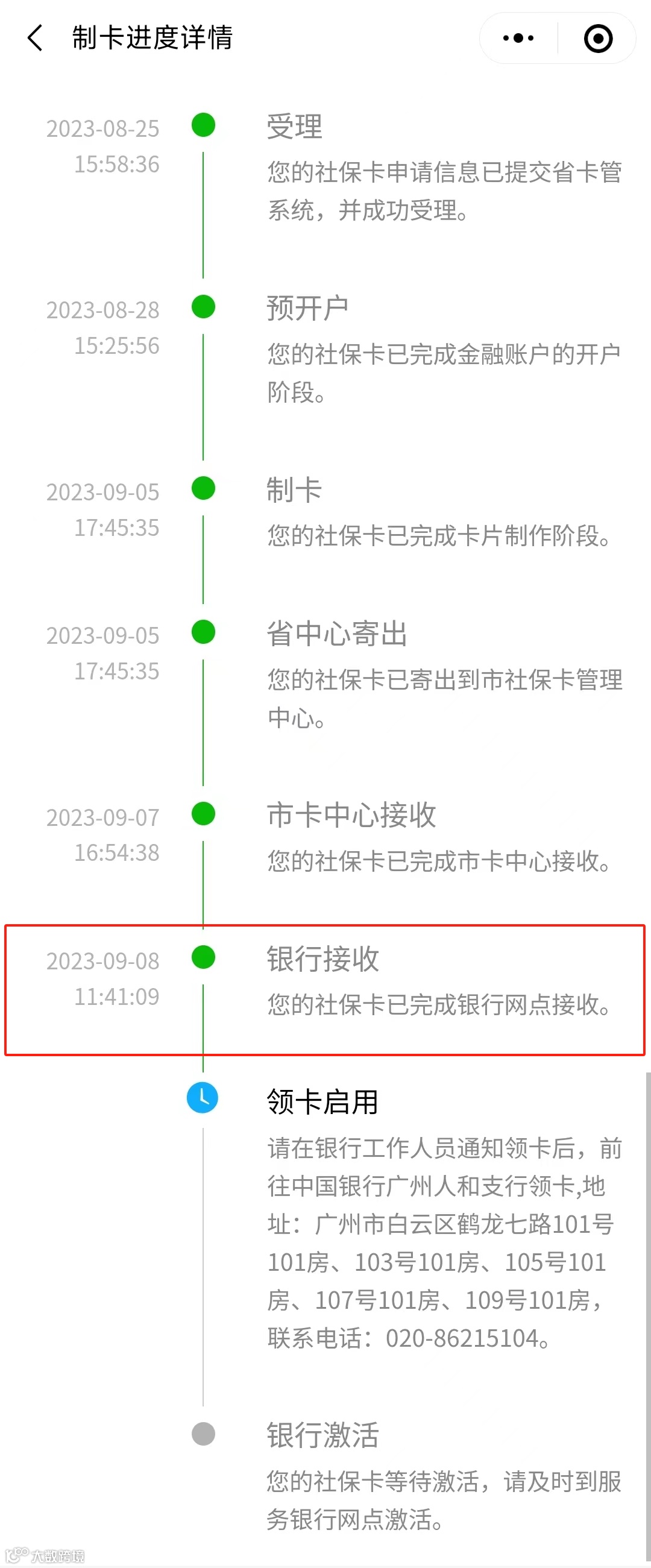 另外,选择邮寄领卡的市民朋友们如果看到“市中心接收”环节完成记得留意邮政公司的派件通知短信哦